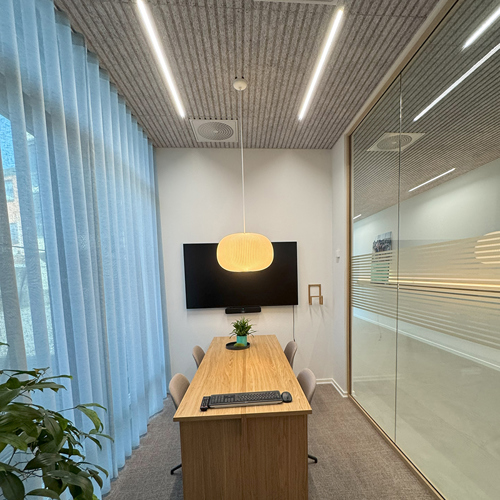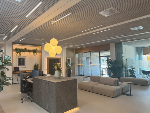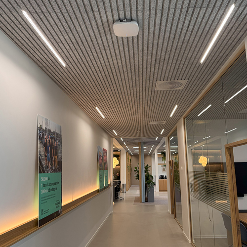 Til filialen er der valgt green:ID LED lysskinner, som er udviklet specifikt til montering i Troldtekt- og træbetonlofter. Den planforsænkede version i 120 cm skaber en rolig og ensartet loftsflade, hvor lyset fremstår diskret, men effektivt. Løsningen harmonerer elegant med de valgte “v-line” Troldtekt akustiklofter.
