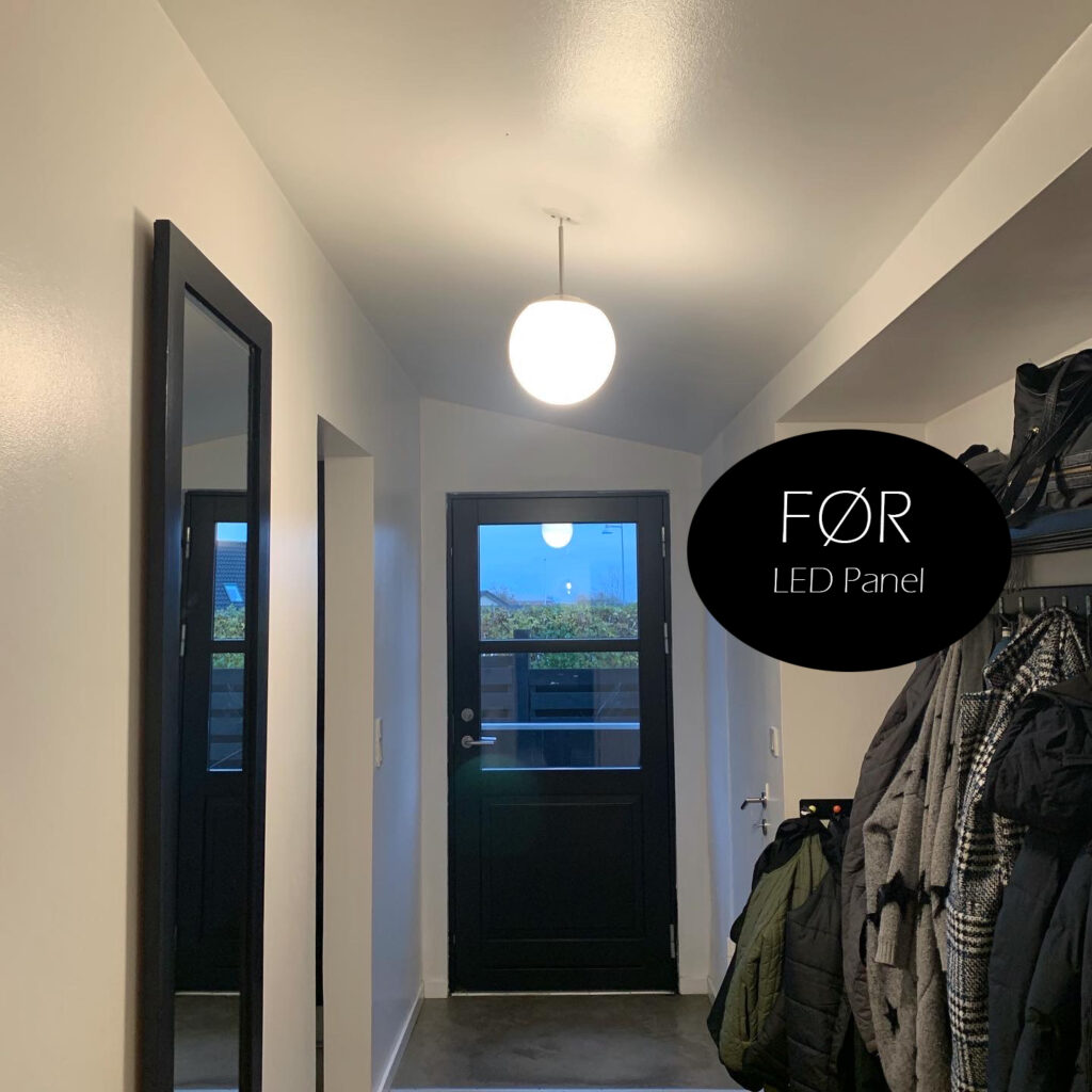 LED Panelet har tilført rummet et rigtig godt og strømbesparende lys, hvilket jo både er fordelagtigt for miljø og pengepung. Derudover har det givet et enkelt og stilrent look i vores entre og en fornemmelse af mere rummelighed.